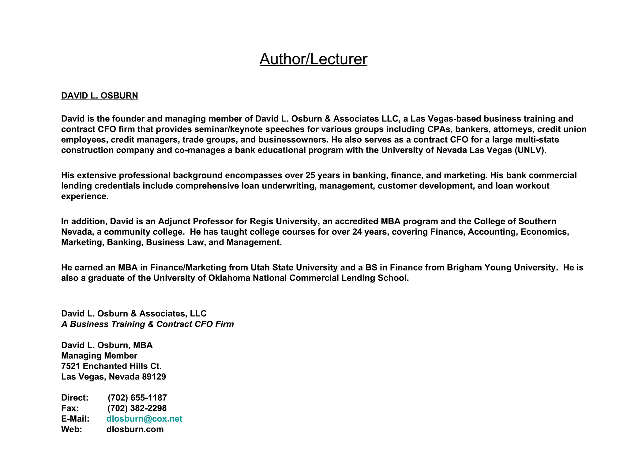 David L. Osburn is a seasoned expert in credit analysis with over 25 years of experience in banking and finance, providing business training and serving as a contract CFO. The document outlines fundamental concepts of credit analysis, including the five 'Cs' of credit, relevant legal regulations, and the importance of credit policy and investigations. It emphasizes the pivotal role of credit in various economic contexts, such as individual companies and households.