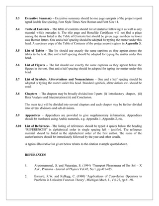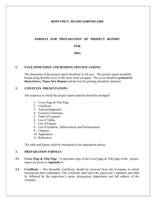 The document provides formatting guidelines for a project report for an MBA degree. It outlines specifications for page dimensions and binding, as well as the order and formatting of the report's contents. This includes sections for the cover page, table of contents, chapters, appendices, and references. Examples are provided for the cover page, table of contents, and typical chapter headings. Report chapters should include an introduction, data analysis, and conclusion. The text should be typed in Times New Roman font, with chapter headings in size 30 bold font and other text in size 14 font. Margins, spacing, and stylistic elements are also specified.