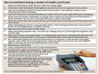 Credit card fraud is a type of theft where a credit card or payment information is used without authorization to obtain money or goods. Common types of credit card fraud include counterfeiting cards, using lost or stolen cards, providing card details without the physical card, and identity theft. An estimated Rs 8.2 crore is lost annually in India to credit card fraud. Victims have included ordinary citizens as well as prominent individuals. Fraud can be committed by cloning cards using scanning devices or stealing card information through unsecure online transactions. Consumers should protect themselves by being vigilant with their cards and payment details.