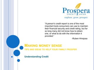 A person's credit report provides important information about their financial history and creditworthiness. It is important to understand credit reports and how to maintain good credit. Some key things to understand include the different types of credit, your rights and responsibilities regarding credit use, how to obtain and read your credit report, factors that affect your credit score, and steps to correct any errors on your report. Regularly reviewing your credit report and practicing responsible credit habits can help you make informed financial decisions and protect your credit rating over time.