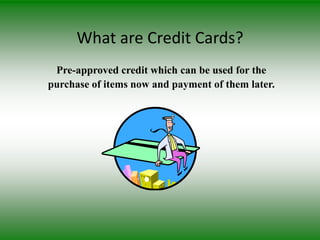 Credit cards are plastic cards that allow users to make purchases now and pay for them later. They provide pre-approved credit up to a set limit. To be eligible, one must have a bank account and be deemed creditworthy based on income, assets, and expenses. Credit cards display key information like the card number, expiration date, security features, issuing bank, and signature strip. They are classified based on payment type, user status, validity area, brand affiliation, and issuing institution. Credit cards offer convenience for users and guaranteed payment for merchants, while banks earn revenue from fees. However, they also carry risks like debt, fraud, and theft for users and merchants. Safety tips include signing cards, reporting loss/theft