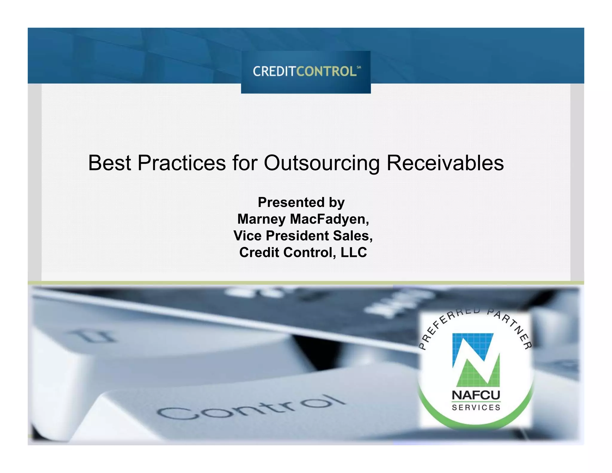 The document provides an overview of best practices for outsourcing receivables collections. It discusses the risks and benefits of outsourcing, as well as keys to success. Case studies show how two credit unions reduced costs and increased returns by outsourcing to Credit Control. The presentation emphasizes selecting a financially stable vendor with industry experience, strong client support, and national licensing. It also stresses the importance of accurate data, service level expectations, and compliance with numerous regulations to protect members' data and privacy.