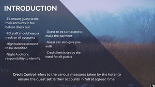 The document outlines credit control measures in front office operations of hotels, emphasizing the importance of ensuring guests settle their accounts on time. It discusses the roles of front office staff and night auditors in managing cash flow, establishing internal controls, and addressing common credit control issues. Additionally, it highlights methods to prevent potential credit risks and the procedures for handling payments from various guest types, including those using credit cards, travel agents, and corporate clients.