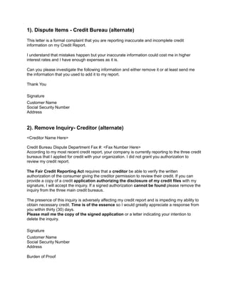 The document outlines various credit dispute letters that can be customized and used with the Credit-Aid software to address inaccuracies in credit reports. It emphasizes the importance of maintaining accurate credit reporting and provides templates for formally disputing items with credit bureaus or creditors. Additionally, it clarifies that Credit-Aid offers tools and information for managing credit disputes but does not provide legal advice.