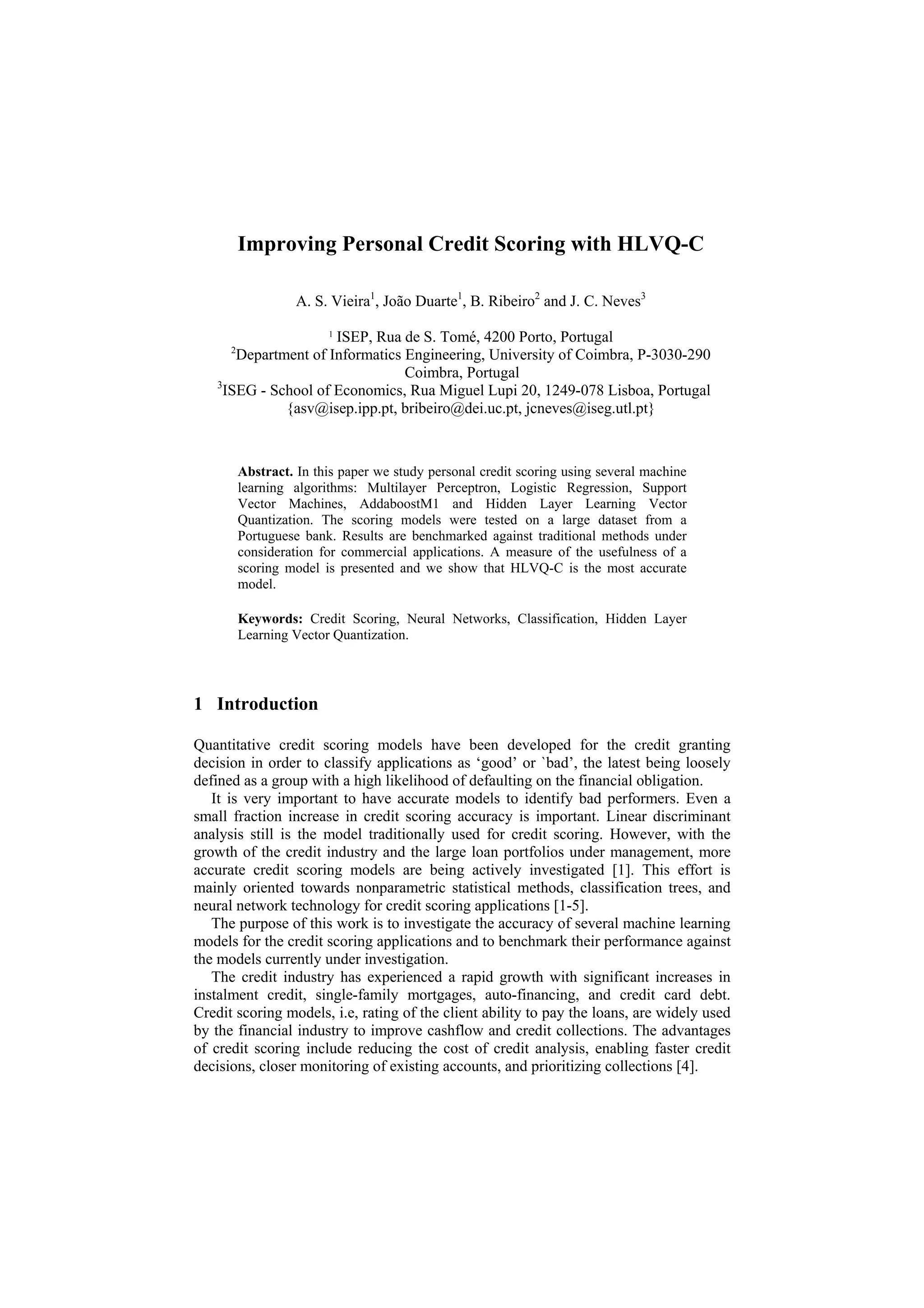 The document proposes using several machine learning algorithms, including multilayer perceptron neural networks, logistic regression, support vector machines, AdaBoostM1, and Hidden Layer Learning Vector Quantization (HLVQ-C), to improve personal credit scoring accuracy. The algorithms were tested on a large dataset from a Portuguese bank containing over 400,000 entries. HLVQ-C achieved the most accurate results, outperforming traditional linear methods. The document introduces a "usefulness" measure to evaluate classifiers based on earnings from correctly denying credit to risky applicants and losses from misclassifications.