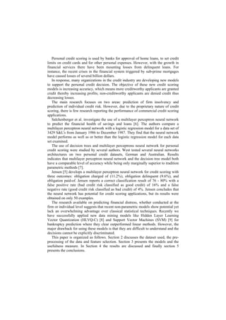 This document presents a study comparing several machine learning models for personal credit scoring: logistic regression, multilayer perceptron, support vector machine, AdaBoostM1, and Hidden Layer Learning Vector Quantization (HLVQ-C). The models were tested on datasets from a Portuguese bank. HLVQ-C achieved the highest accuracy and was the most useful model according to a proposed measure that considers earnings from denying bad credits and losses from denying good credits. While other models had higher error rates for good credits, HLVQ-C balanced accuracy and usefulness the best, making it suitable for commercial credit scoring applications.