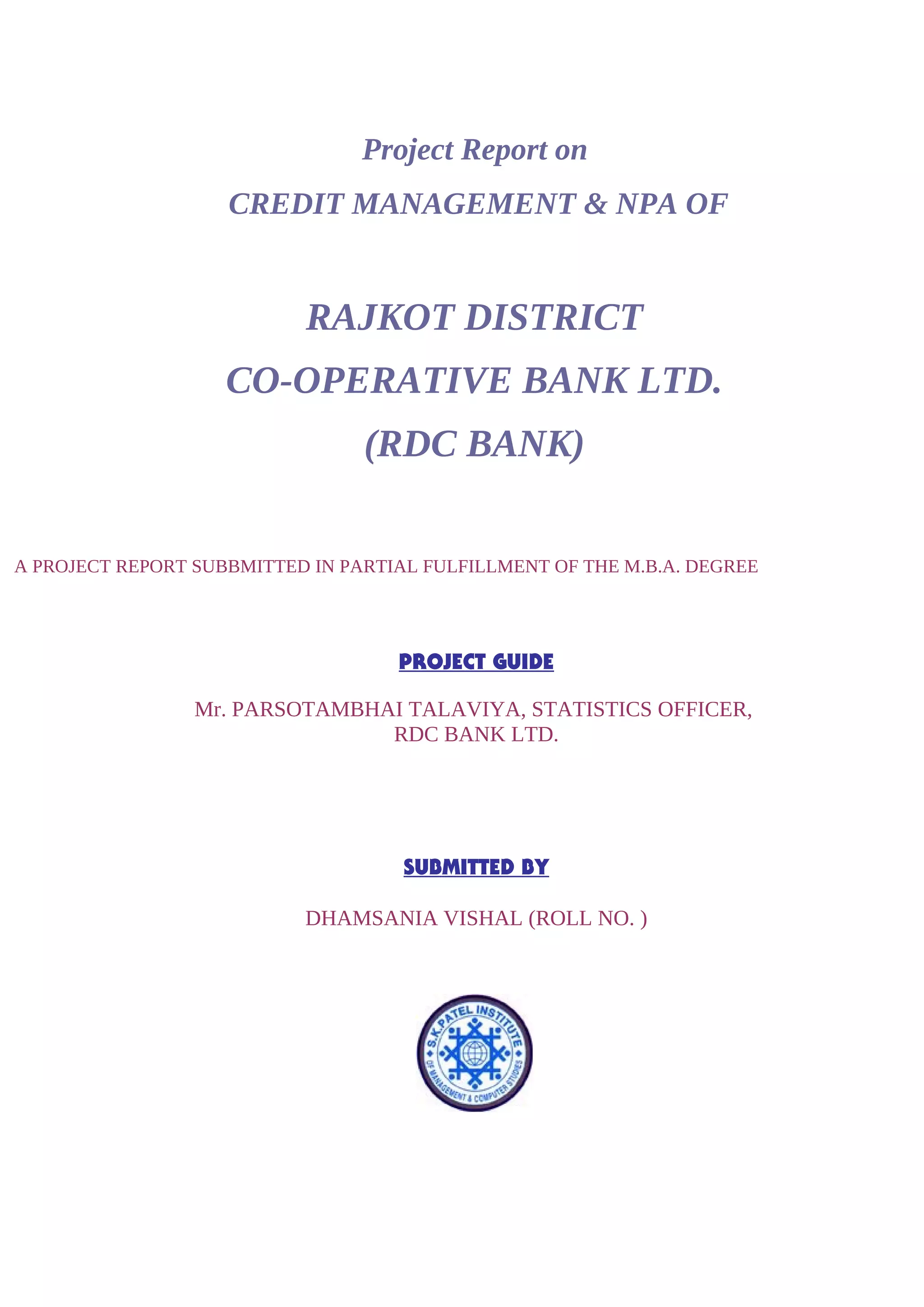 This document is a project report on credit management and non-performing assets (NPAs) of Rajkot District Co-operative Bank Ltd. (RDC Bank). It discusses the history and background of RDC Bank, which was established in 1959. It then covers various aspects of credit management at RDC Bank, including credit policies, appraisal, monitoring, NPAs, and recovery processes. The report aims to analyze credit management practices and suggest improvements to reduce NPAs.