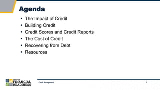 The document covers essential aspects of credit management including the impact of credit, building credit, and understanding credit scores and reports. It discusses wise and unwise uses of credit, costs associated with credit, and strategies for recovering from debt. Additionally, it provides resources for personal financial management and emphasizes the importance of credit health.