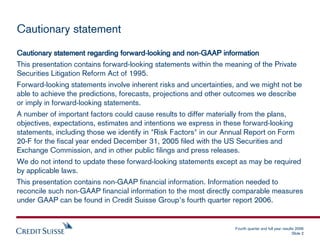 Credit Suisse reported record results for the fourth quarter and full year 2006. Net income for 2006 increased 94% to CHF 11.3 billion compared to 2005. Investment Banking saw significant revenue growth across its businesses. Private Banking achieved record profitability while expanding internationally. Asset Management completed a business realignment while launching new growth initiatives.