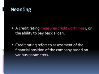 Credit ratings are assessments of creditworthiness or ability to repay loans, conducted by credit rating agencies. The top three agencies in the US are Moody's, Standard & Poor's, and Fitch Ratings, while in India they are CRISIL, CIBIL, and Fitch Ratings India. Credit ratings benefit investors by indicating risk, companies by lowering borrowing costs, and intermediaries by simplifying investment decisions. CRISIL analyzes factors like capital adequacy, asset quality, management capability, earnings, liquidity, and sensitivity to determine long-term credit ratings ranging from highest safety (AAA) to default (D).