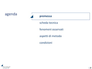 Il documento presenta i risultati di un osservatorio annuale sui metodi di gestione del credito utilizzati dalle imprese italiane, realizzato da Format Research dal 2006. Include informazioni riguardo al campionamento, la metodologia delle interviste e l'analisi della domanda e dell'offerta degli strumenti di gestione del credito. I risultati dell'indagine sono destinati ai sottoscrittori e possono essere personalizzati a pagamento, mantenendo la proprietà dei dati per i committenti.