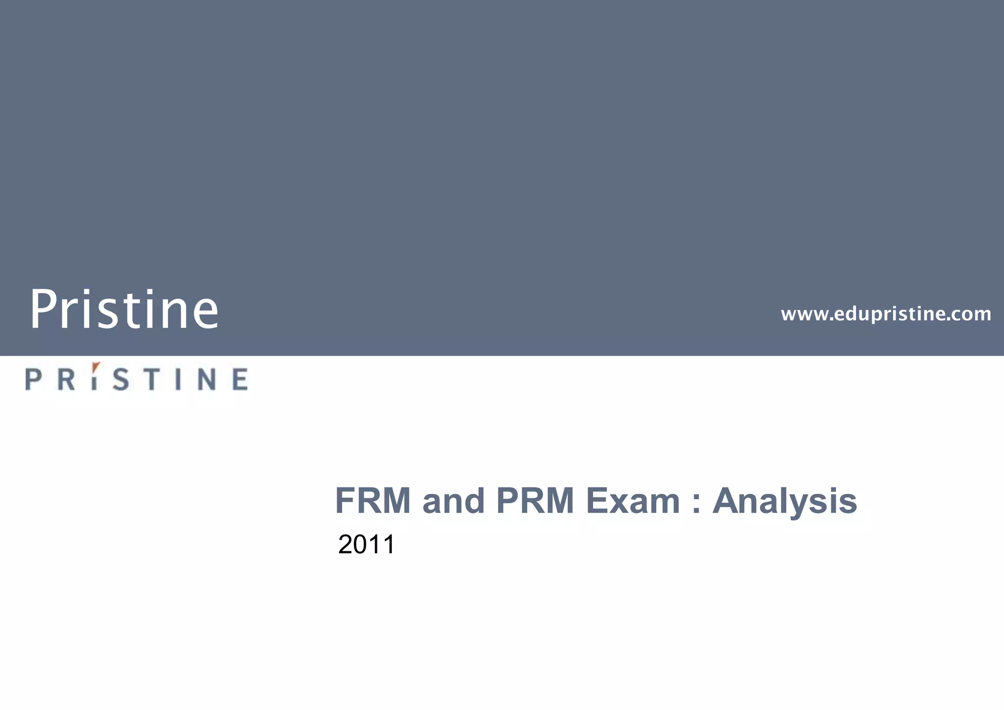 Pristine is a leading training provider in India for international finance certifications such as CFA, FRM, and PRM, offering classroom and online courses with a high success rate for candidates. The document details eligibility requirements, exam patterns, fees, and resources for FRM and PRM exams, highlighting Pristine's extensive training history and partnerships with major financial institutions. Additionally, it provides an analysis of exam syllabi and question patterns, emphasizing the focus on quantitative analysis and risk management.