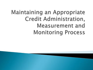 The board of directors is responsible for overseeing the bank's credit risk strategy and policies. They should approve a credit risk strategy that defines the bank's risk appetite. Senior management is then responsible for implementing this strategy through establishing a sound credit granting and administration process. This includes setting credit policies, limits, and criteria and monitoring loans. An effective credit risk management system involves identifying, measuring, monitoring, and controlling credit risk, and includes internal risk ratings, management reporting, and independent credit reviews.