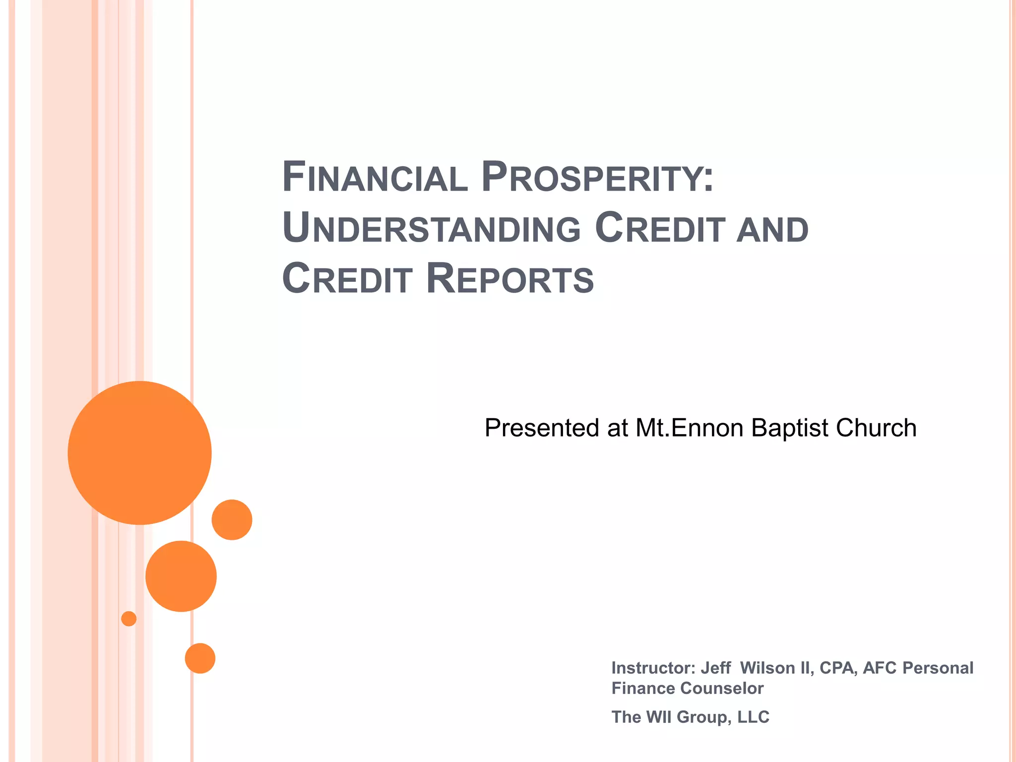 Jeff Wilson II, a personal finance counselor and CPA, presented on understanding credit reports and credit scores. He discussed what is included in a credit report, how credit scores are calculated, and factors that affect credit scores like payment history and credit utilization. He also provided tips for disputing errors, building credit, dealing with debt collectors, and help determining if bankruptcy is the right option. The presentation aimed to help participants better understand their credit and take steps to improve their financial prosperity.