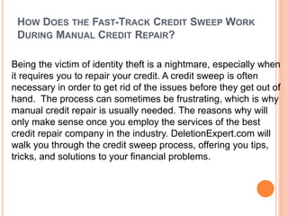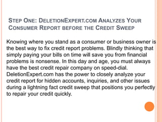 The document discusses the fast-track credit sweep process during manual credit repair with DeletionExpert.com. It is a 3 step process where they first analyze the consumer report, then submit hand-written disputes to creditors and bureaus, and finally continue disputes until all credit issues are permanently repaired. The process aims to identify and remove hidden accounts, inquiries, and other issues through a comprehensive credit sweep to quickly and easily repair one's credit.