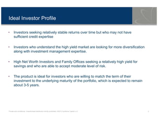 This document provides information about Symfonie Capital and its investment strategies and services. Symfonie Capital offers portfolio management focused on high yield credit instruments, including two funds - one focused on bonds and the other on peer-to-peer loans. The document describes Symfonie's investment process, team, risks, and track record of outperforming credit market indexes.