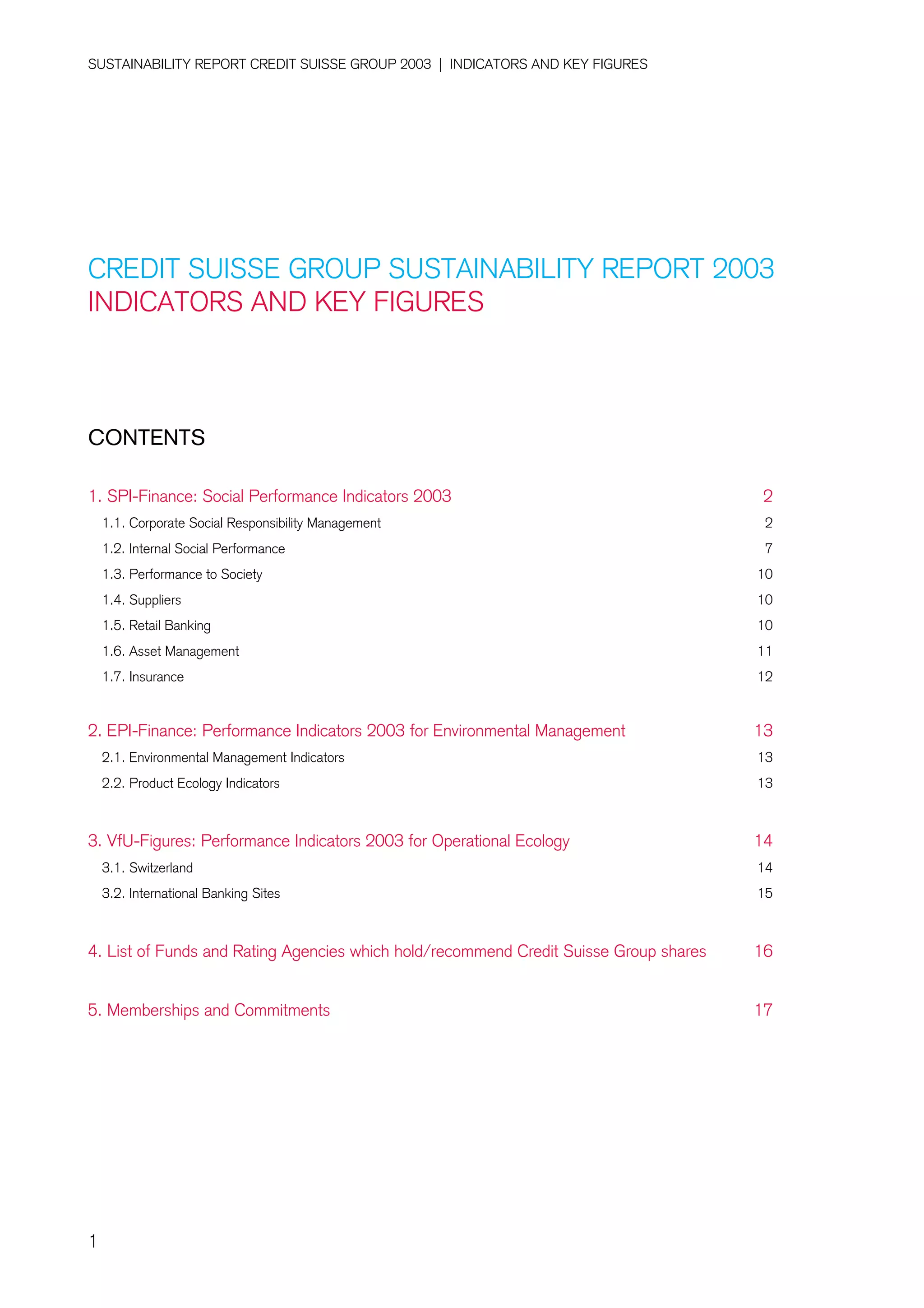 This document is Credit Suisse Group's 2003 sustainability report which provides indicators and key figures on their social, environmental, and operational performance. The report includes sections on social performance indicators related to corporate social responsibility management, internal social performance, performance to society, suppliers, retail banking, and insurance. It also includes sections on environmental management indicators, product ecology indicators, and operational ecology indicators for Switzerland and international banking sites. The report shows Credit Suisse Group's commitment to corporate social responsibility and sustainability across their business operations through comprehensive management systems, policies, and stakeholder engagement. Key focus areas include equal opportunity, freedom of association, training, health and safety, and responsible restructuring.