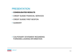 The document summarizes Credit Suisse's financial results for the first quarter of 2003. Key points include: - Credit Suisse reported a net profit of CHF 652 million, compared to a net loss of CHF 950 million in the previous quarter. - Credit Suisse Financial Services saw a net profit increase of 13% compared to the first quarter of 2002, driven by improved results across all business segments. - Credit Suisse First Boston returned to profitability with a net operating profit of USD 292 million, up from USD 11 million the previous quarter, due to higher fixed income revenues and lower credit provisions.