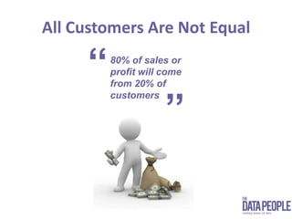 This document discusses how The Data People uses data analytics to help businesses better understand their customers. They identify a company's most valuable customers through analyzing data on profitability, attitudes, demographics and more. The Data People then builds customer profiles and segments to tailor marketing strategies. Case studies show how they helped clients like Alliance & Leicester and Holmes Place increase response rates, reduce costs and lower customer churn through data-driven insights.