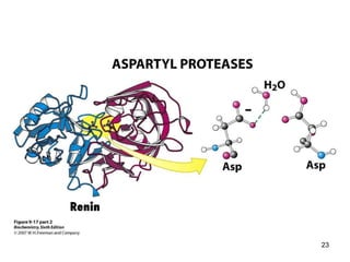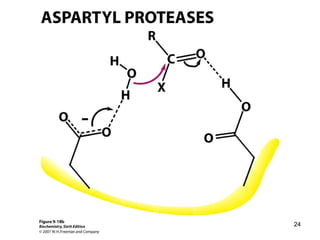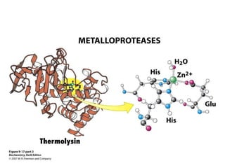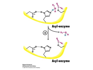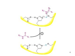 catalytic strategies Uiteenvallenvan tetraëder Het proton van het positief geladen His wordt overgedragen aan de aminogroep die gevormd is door verbreking van de peptide binding.