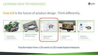 This document discusses model-based definition (MBD) and the benefits it provides over traditional 2D drawing-based processes. It notes that MBD, by capturing all product information within a 3D model, eliminates inefficiencies in traditional processes where 2D drawings must be created and kept in sync with 3D models. It then highlights how the Creo GD&T Advisor extension helps users more easily create and validate geometrical dimensioning and tolerancing information within models, improving compliance with MBD standards and reducing errors. Key industries that are leading adoption of MBD like aerospace, defense, and automotive are mentioned.