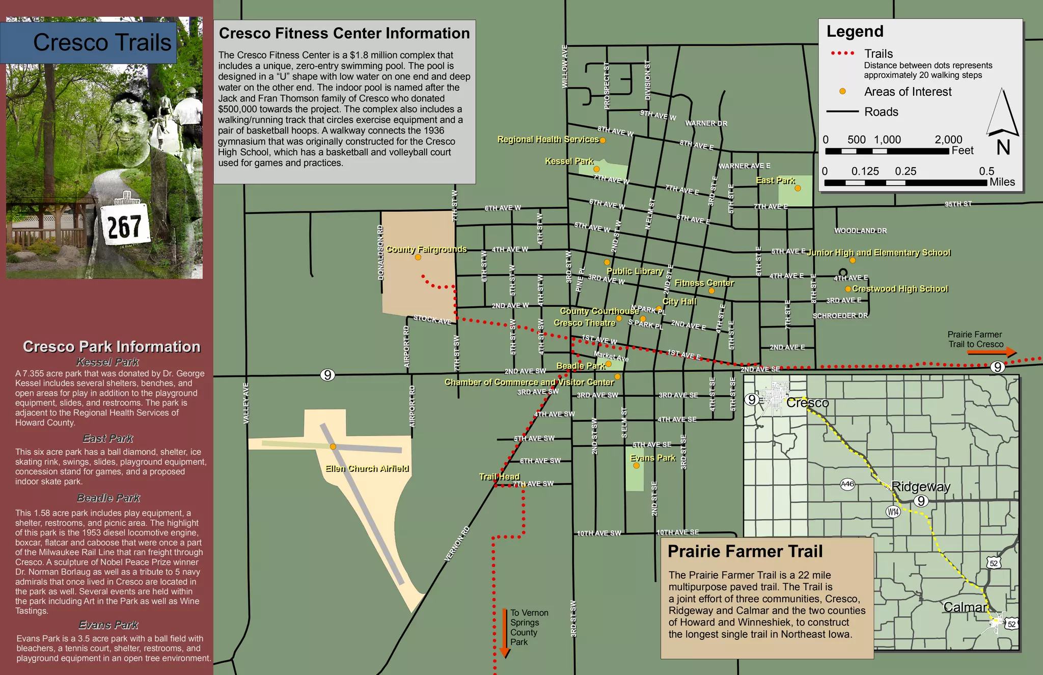 The Cresco Fitness Center is a $1.8 million complex that includes an indoor zero-entry swimming pool designed in a "U" shape. The complex also includes a walking/running track, exercise equipment, and basketball hoops. A walkway connects the fitness center to the 1936 Cresco High School gymnasium that has basketball and volleyball courts.