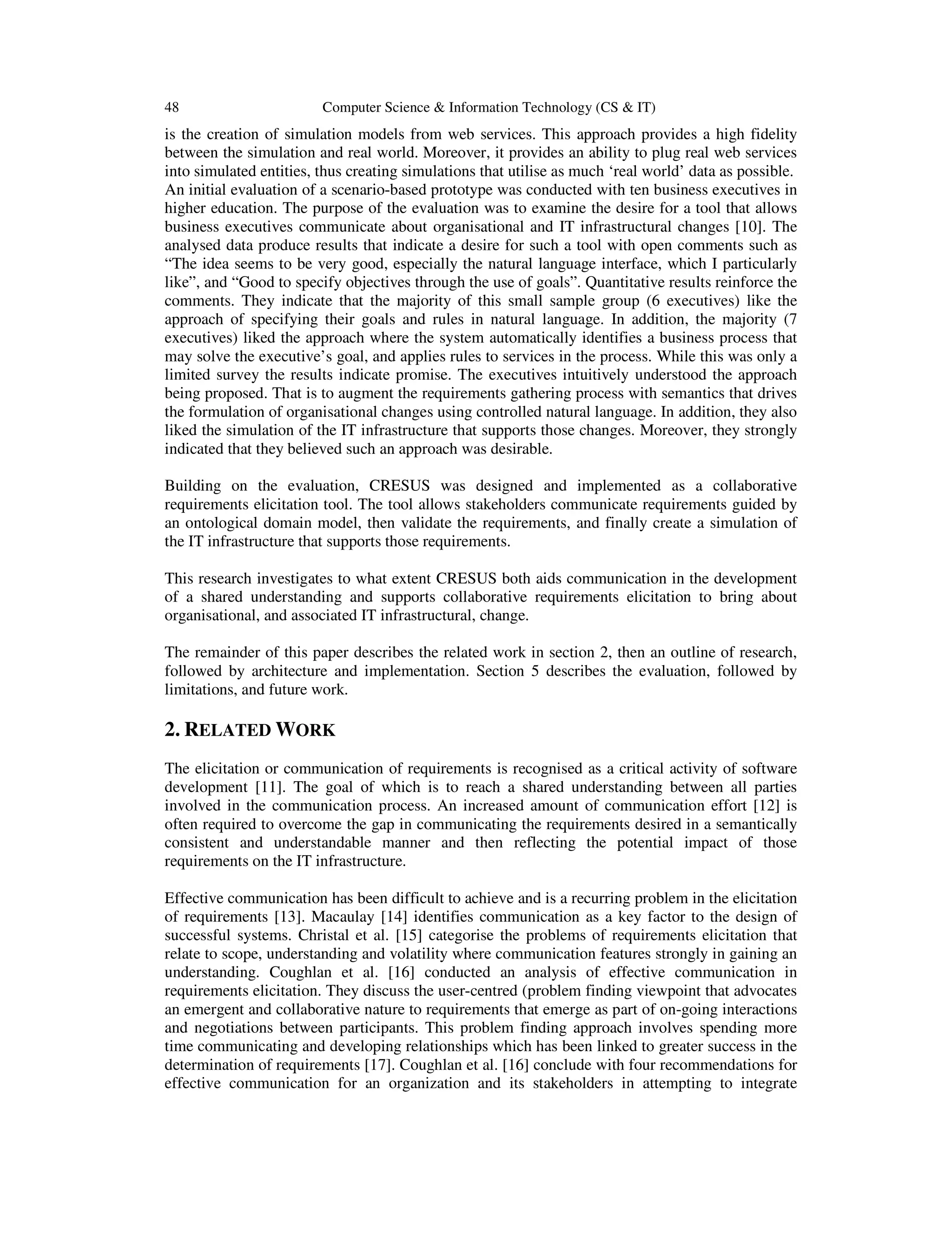 This document discusses the development of CRESUS, a collaborative requirements elicitation tool designed to enhance communication among stakeholders in organisations regarding IT infrastructure changes. The tool incorporates controlled natural language and simulation techniques to support a shared understanding of requirements, and initial evaluations suggest positive feedback from business executives on its usability. The paper details the architecture, implementation, and evaluation process of CRESUS, emphasizing the importance of effective communication in software development projects.