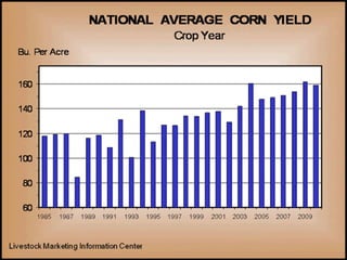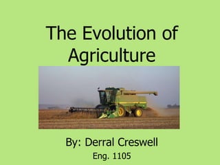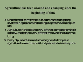 Agriculture has evolved significantly over time from relying on primitive tools and manual labor to modern machinery and biotechnology. Early agriculture used simple tools and animals to farm with little yield, while present-day agriculture utilizes expensive machinery, wider ranges, and more people in different occupations. As the population grows, the food supply struggles to keep up, so scientists are looking into biotechnology and soil biology to develop high-yielding hybrid crops that can feed more people. The future of agriculture is promising with new technologies being researched to push yields and better understand soil, ensuring food availability for the growing global population.