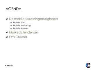 CREUNAS MOBILE YDELSERWeb 2.0 Mobile PIM Device M. Mobil Integration Mobilt Intranet 2D stregkoder Instore promotion SMS notifikationer SMS information SMS konkurrencer Email2SMS Mobile Sites Line Of Business BlueT. mobil portaler Mobile promotion marketing Web2Mobile Den mobile udvikling Mobile Marketing / B2C Mobile Business / B2B Mobile Web / B2C og B2B Location- based