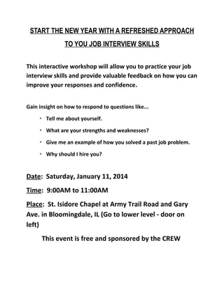 This document announces a workshop to help participants refresh their job interview skills. The interactive workshop on January 11th will allow practice of interview skills with feedback to improve responses and confidence. Attendees will gain insight on answering common questions like telling about themselves, strengths and weaknesses, solving past work problems, and reasons for being hired.
