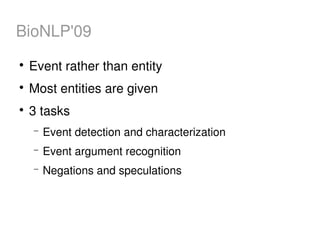 This document discusses conditional random fields (CRFs) and their use for named entity recognition and event extraction tasks. It notes that CRFs address the label bias problem of hidden Markov models (HMMs) and maximum entropy Markov models (MEMMs) by conditioning on observations and considering many feature types. CRFs model transition probabilities between states and state probabilities conditioned on observations, using edge features between labels as well as vertex features of the observations.