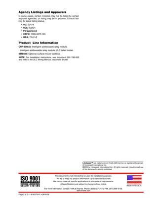 The CRF-300(A) Addressable Relay Module provides a dry contact output that can be activated through panel programming to control auxiliary devices like fans, doors, and dampers. It uses LiteSpeed communication to provide faster response than other designs. Key features include built-in type identification, LED indicator, high noise immunity, and direct-dial addressing. The module uses one SLC loop address and can switch two dry contacts to control notification appliances or other loads rated up to 3A resistive.