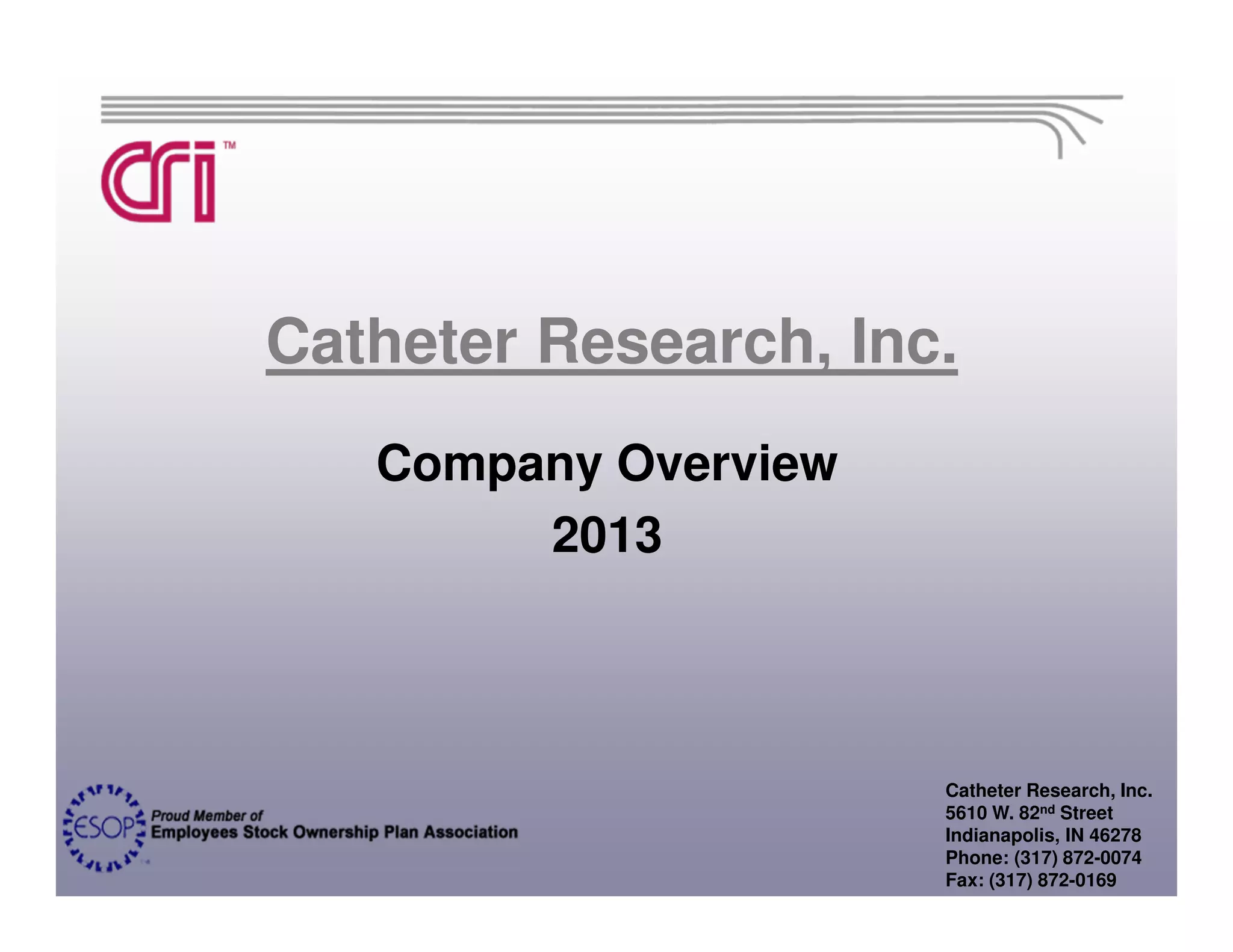 Catheter Research Inc. is a leading medical device manufacturer specializing in catheter design, medical tubing, and OBGYN disposables. It has 145 employees and is ISO 13485 certified. CRI provides contract manufacturing services for medium and large medical device companies as well as produces its own proprietary OBGYN product line under the Thomas Medical brand.