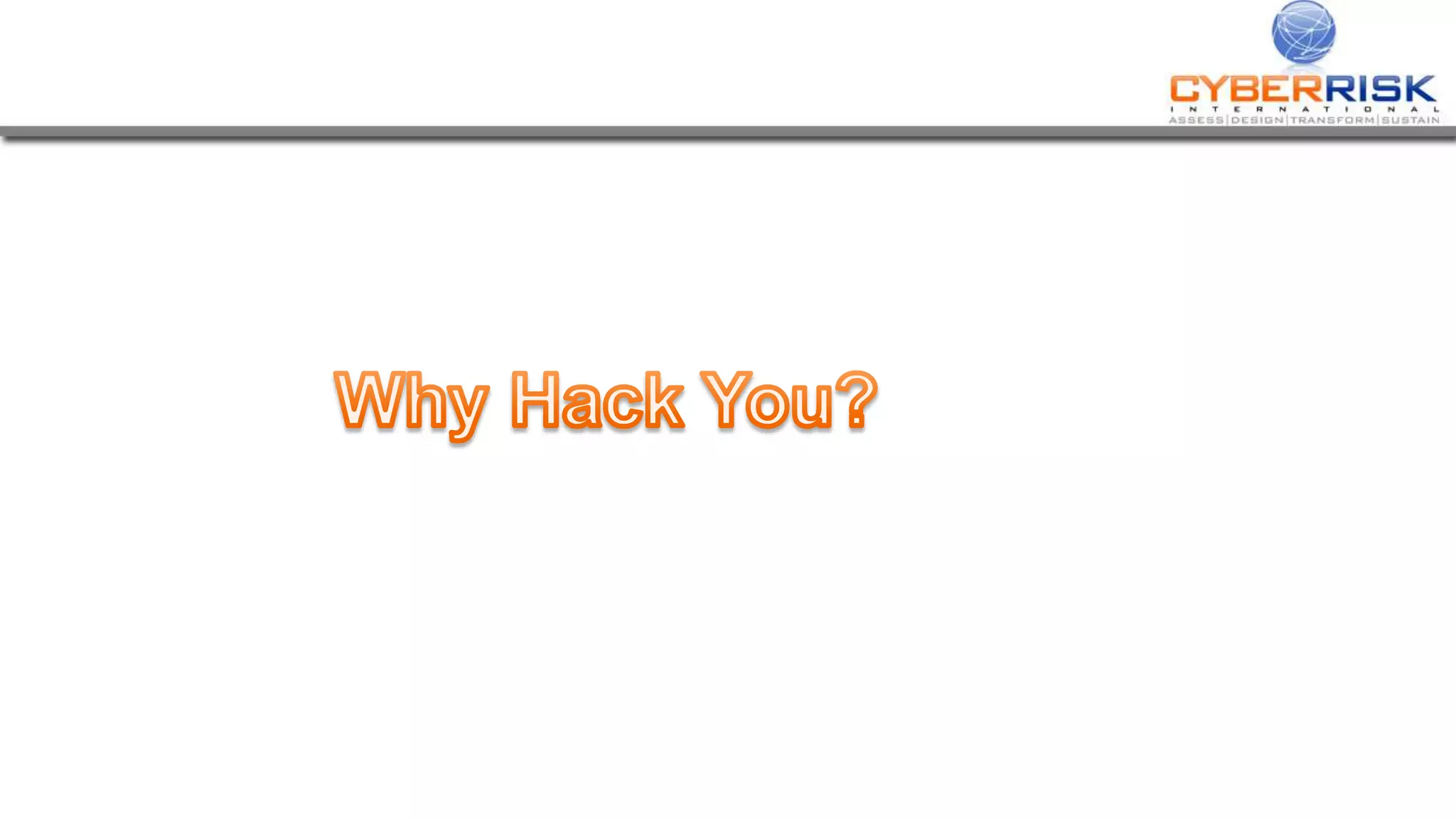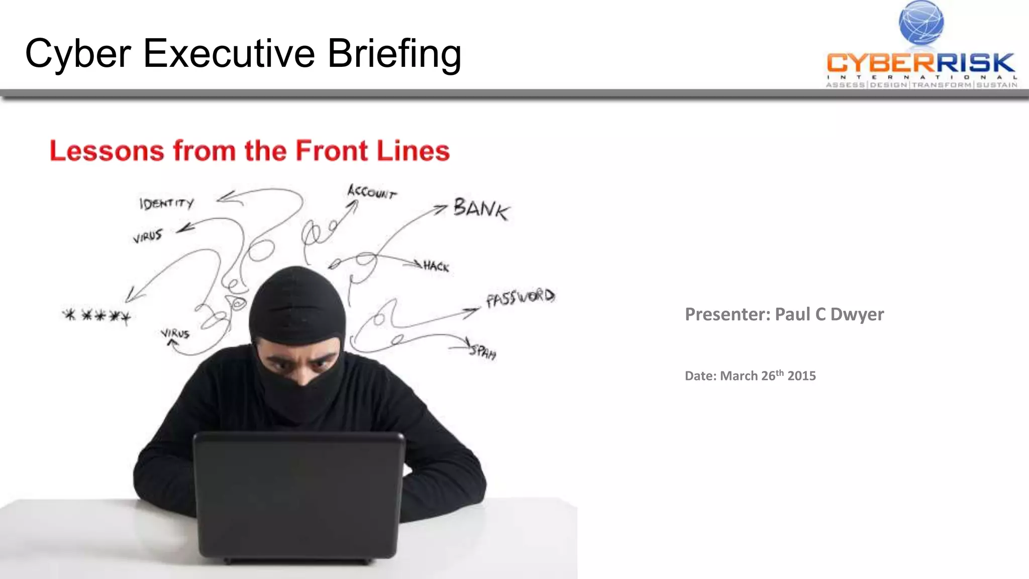 This document provides a high-level summary of a cybersecurity briefing presented by Paul C Dwyer on March 26th 2015. It discusses various cyber threats including cybercrime, cyber warfare, cyber espionage, and more. Specific topics covered include the cyber threat landscape, what cyber threats want to achieve, cybercrime drivers and statistics, the progression of threats over the past 10 years, cybercrime tools and operations, and predictions for the future of cybersecurity challenges.