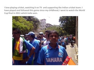 I love playing and watching cricket, having supported the Indian team since childhood including attending their 2011 World Cup victory. Cricket helped develop teamwork, leadership, self-discipline, patience and mental toughness in dealing with winning and losing, while also realizing people have different abilities - qualities that have contributed greatly to professional development as they are equally valuable in business.