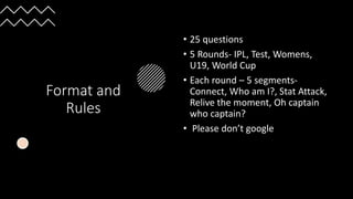 This document provides information about the format and rules for a trivia game with 5 rounds covering different formats of cricket: IPL, Test matches, women's cricket, Under 19 World Cups, and the Cricket World Cup. Each round has 5 segments - connection point, who am I, stat attack, relive the moment, and oh captain who captain. The first sample round provides trivia questions about the IPL, identifying players, records, and captains.