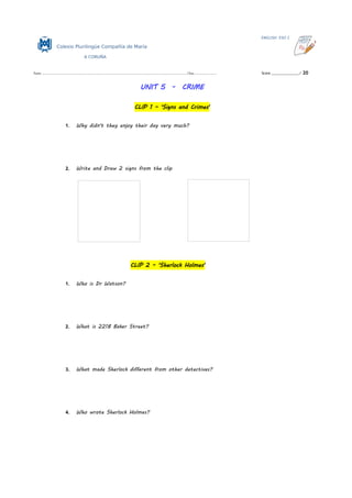 The document contains questions about 4 video clips related to the topic of crime. The clips discuss signs of crime, the fictional detective Sherlock Holmes, ways that thieves steal, and examples of crimes that did not end well for the criminals. Students are asked to answer questions about the clips, describe how they would rob a bank, what they would do with a criminal, what they learned, and draw something related to crime.