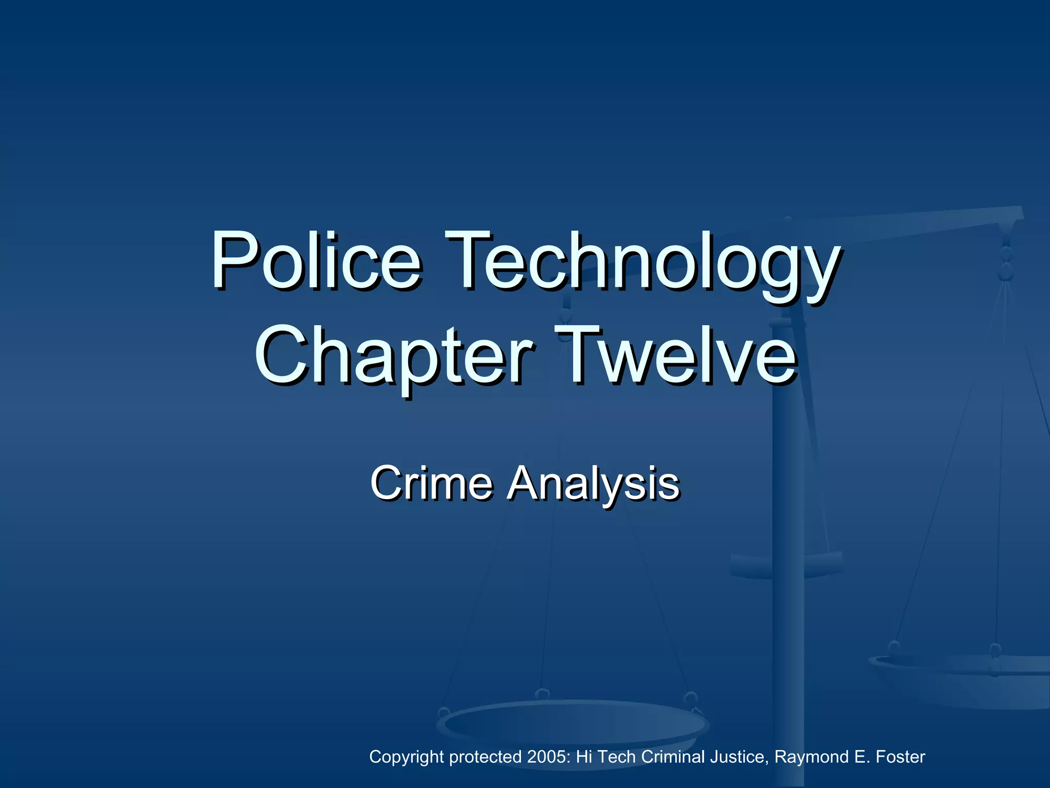 This document discusses crime analysis and its applications in community-oriented policing. Crime analysis involves understanding crime patterns through statistical analysis and crime mapping to identify problems and potential solutions. It helps police departments target areas with high crime rates or unusual increases in crime. Crime analysis also examines relationships between crimes in terms of time, location, offender characteristics, and causal factors to aid investigations of serial crimes and displacement. The core functions of law enforcement like prevention, investigation, and apprehension can be enhanced through crime analysis.