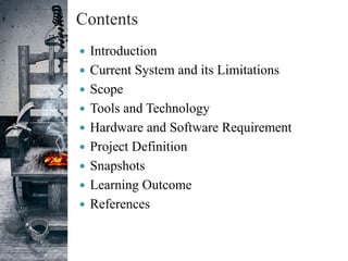 This document outlines a crime detection project that uses machine learning to analyze crime data and predict future crimes. It discusses the current limitations of crime detection systems and how the project aims to provide more accurate and efficient prediction through tools like Python, Pandas, NumPy, Matplotlib and Scikit-learn. The project will preprocess and visualize crime data, train a KNN classifier model, and use location, crime type and time features to predict crimes.