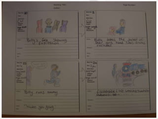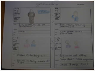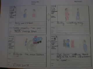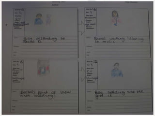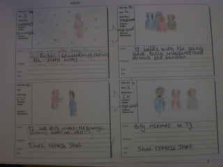 The document presents a script for a film about a teenage boy named Billy who wants to join a gang to earn money, and the gang forces him to rape his cousin Rachel to prove himself, but when he realizes it is his cousin he runs away distraught; it also discusses distributing a questionnaire about crime/drama films and the roles of the characters in the script.