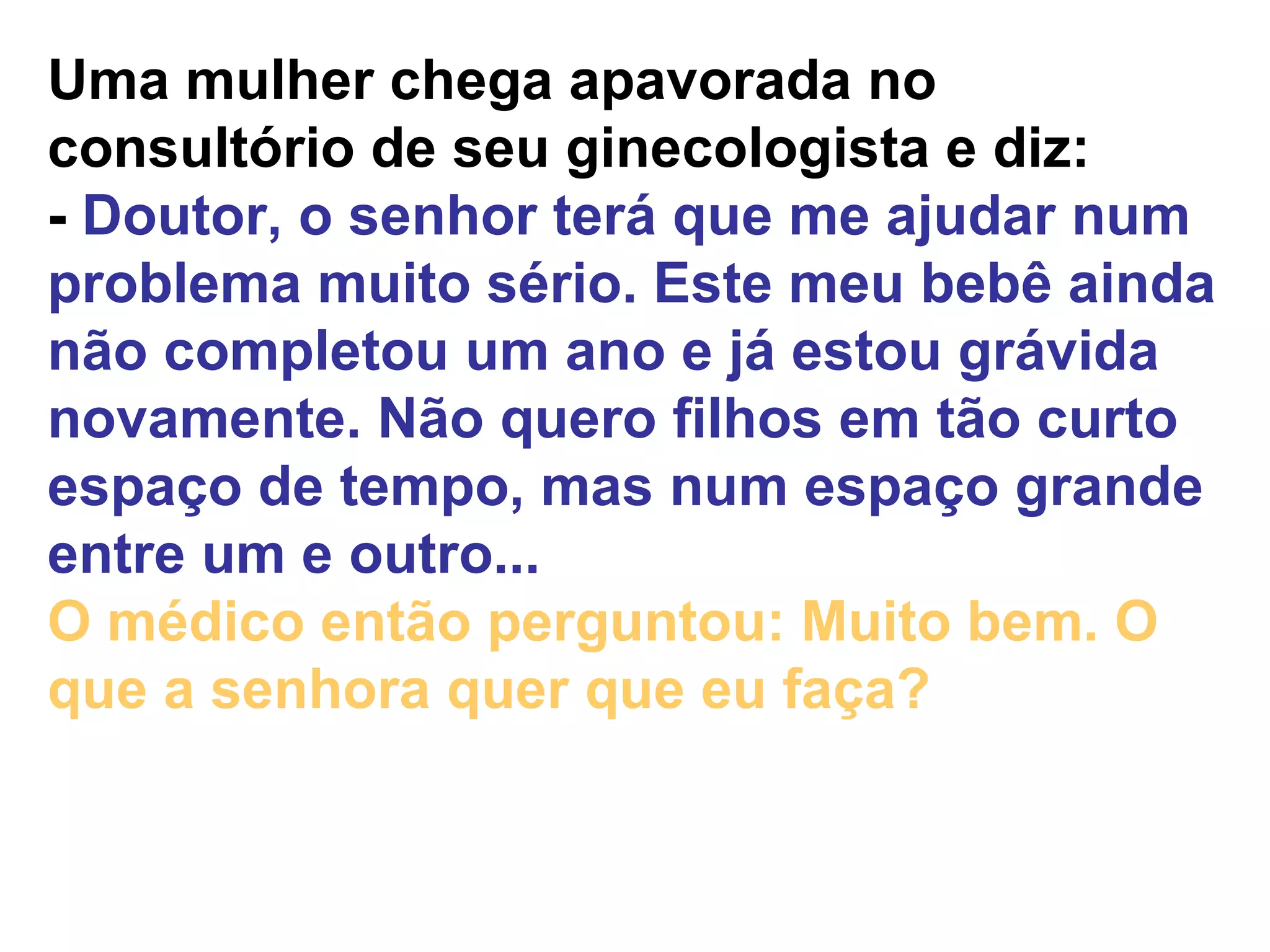 Uma mulher pede ao seu ginecologista para interromper sua gravidez de menos de um ano, pois não quer dois filhos em curto espaço de tempo. O médico sugere matar o bebê que ela já tem nos braços como alternativa, para que ela possa descansar e ter o outro filho mais tarde. A mulher se horroriza com a sugestão, percebendo que matar uma criança, nascida ou não, é um crime.