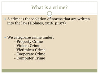 The document discusses crime and violence in Canada. It defines different types of crimes such as property crimes, violent crimes, victimless crimes, and computer crimes. It provides statistics on crime in Canada, noting that reported criminal incidents decreased from 2011 to 2012, largely due to reductions in non-violent crimes. The document also discusses youth crime statistics and notes that nearly 40,000 cases were completed in Canadian youth courts in 2013/2014, which was 12% lower than the previous year. Common youth crimes are discussed as well as the benefits of diversion programs for first-time youth offenders.
