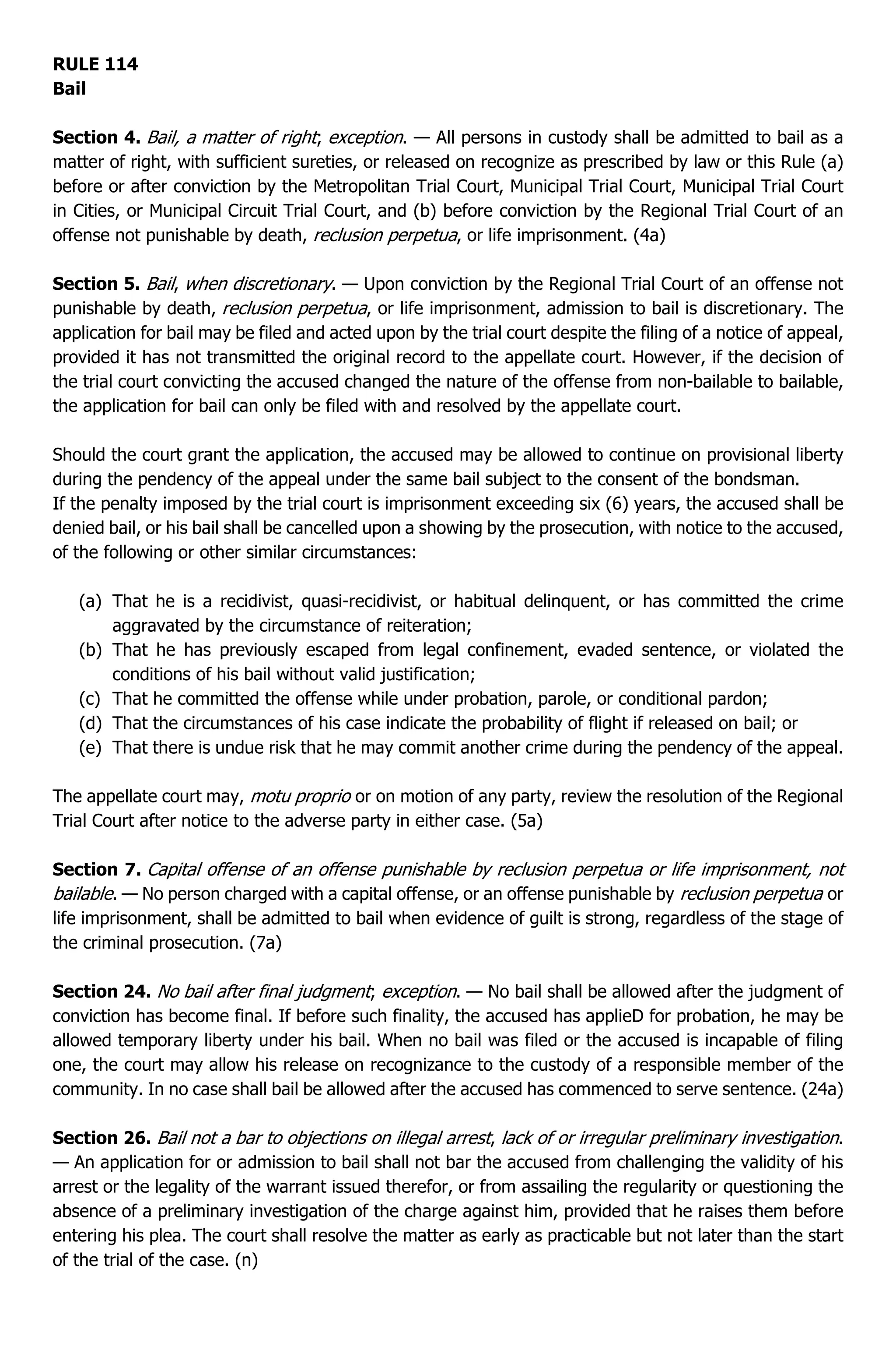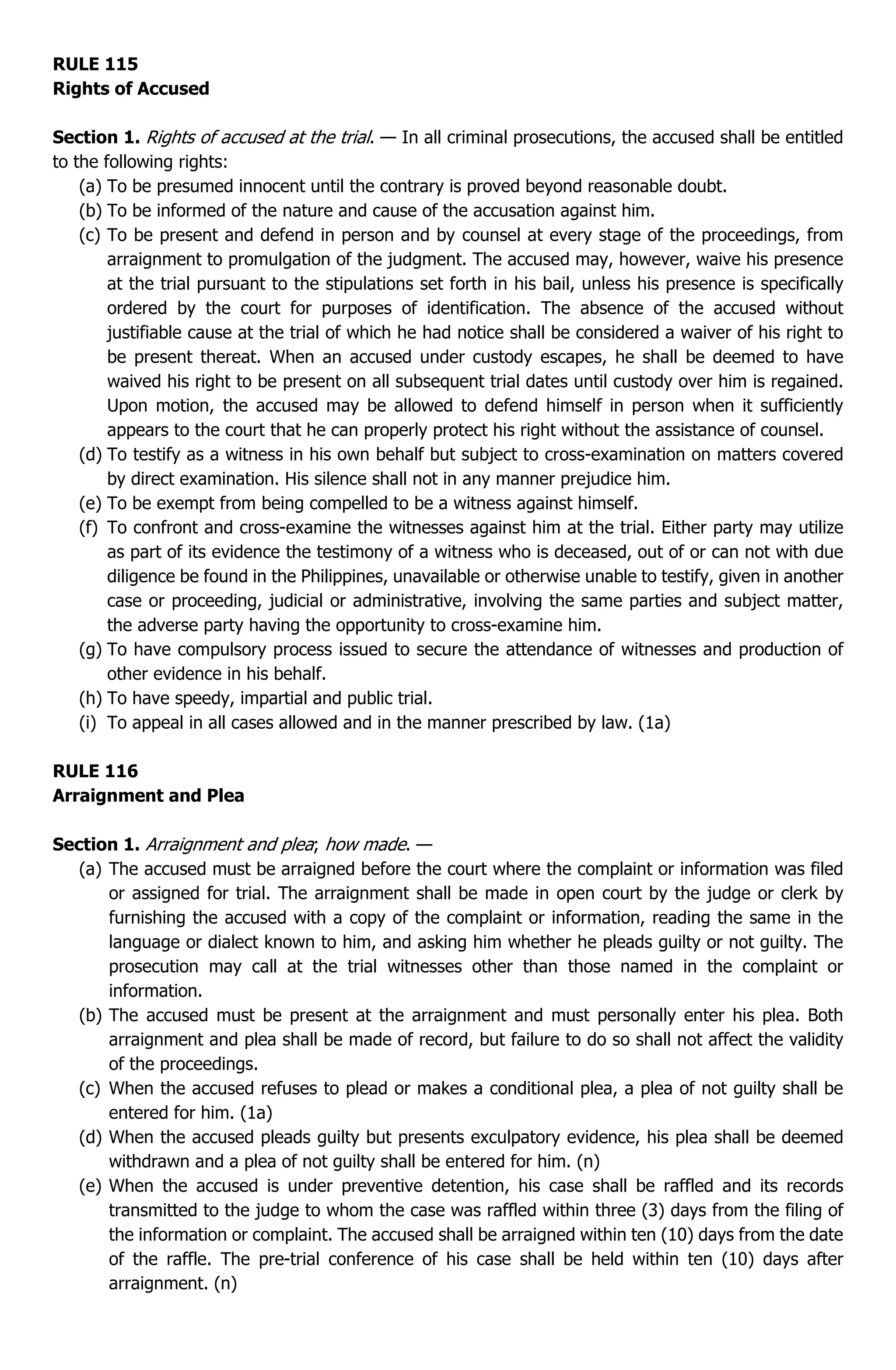The document outlines the regulations and rules regarding bail, rights of the accused, arraignment, and trial procedures in criminal cases. It specifies the conditions under which bail can be granted or denied, the rights guaranteed to the accused during trial, and the formal processes for arraignment and plea. Additionally, provisions are made for pre-trial conferences and the order of trial proceedings, ensuring clarity and fairness in the legal process.