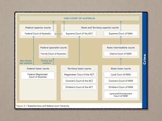 The document provides an overview of the criminal trial process in New South Wales, Australia. It discusses the different courts' jurisdictions and the types of cases they hear. For example, it states that the Local Court hears summary offenses and conducts committal hearings, while the Supreme Court hears the most serious crimes. It also outlines key aspects of the criminal trial process like pleas and charge negotiation, the use of evidence, and the roles of legal personnel and juries. Overall, the document serves as a reference guide to the New South Wales criminal justice system.