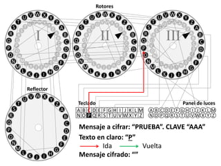 The document describes the encryption of the message "PRUEBA" using a rotor encryption machine. It shows the encryption process step-by-step, with the plaintext being encrypted one letter at a time. The ciphertext generated is "LCFW".
