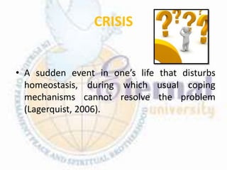 This document discusses crisis, crisis intervention, and the stages of crisis development. It defines a crisis as a sudden event that disrupts homeostasis and normal coping mechanisms. A crisis involves heightened anxiety, acute symptoms, and potential for growth or deterioration. The stages of crisis include impact, recoil, and post-traumatic periods. Crisis intervention aims to resolve the immediate crisis and restore pre-crisis functioning through assessment, planning interventions, and implementing reality-oriented support.