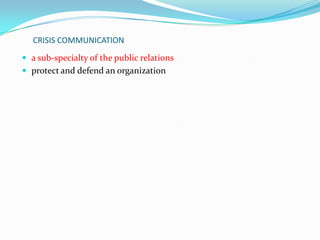 Crisis communication is a sub-specialty of public relations and business continuity that aims to protect and defend an organization during unexpected events or crises. Effective crisis communication requires identifying a crisis communication team and spokespeople, training spokespeople, establishing notification systems to rapidly reach stakeholders through multiple channels, and developing holding statements to communicate immediately after a crisis breaks. The goals are to respond to crises quickly, effectively, and efficiently while maintaining connectivity, accessibility, empathy, information security, and high-volume communication.