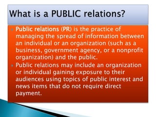 Public relations (PR) involves managing information between an organization and the public. PR professionals typically work for PR/marketing firms, businesses, government agencies, and nonprofits. They address concerns through publicity. Types of PR include financial, consumer, crisis communication, internal/government relations, and media relations. Crisis communication protects reputation during challenges and aims to mitigate damage through communication. When a crisis occurs, PR professionals should tell the full story fast and truthfully to regain public trust. They should prepare detailed crisis plans and response steps to control messaging.
