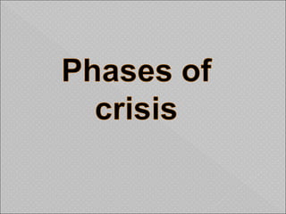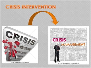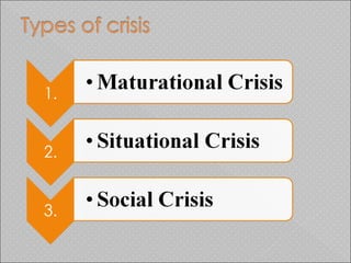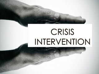 The document outlines the concept of crisis intervention, including its definition, types, phases, and symptoms of crisis. It emphasizes techniques for effective intervention that assist individuals and families in managing overwhelming emotions and restoring normal functioning. The role of nurses in crisis intervention is highlighted, focusing on communication and supportive strategies.