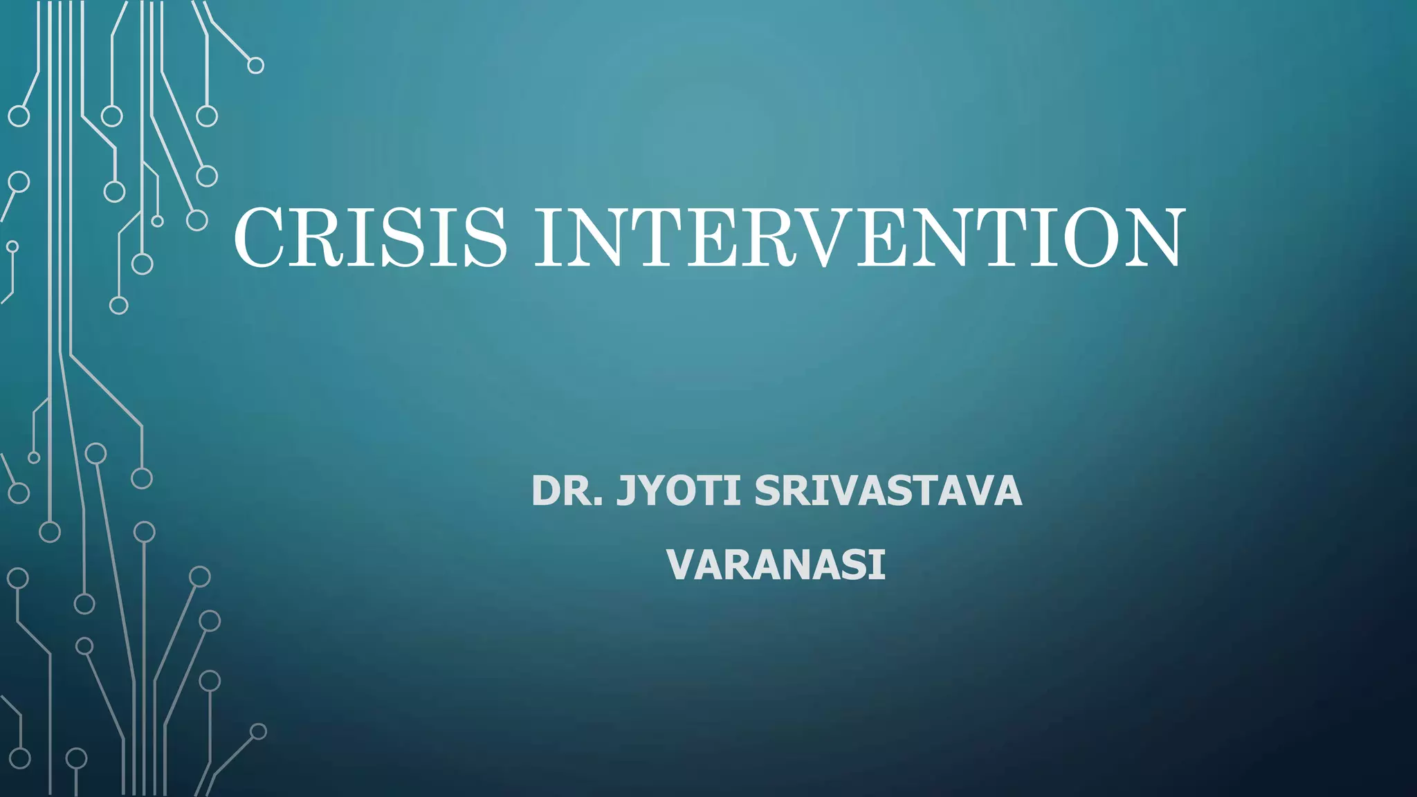 This document discusses crisis intervention. It defines a crisis and lists its characteristics. It describes different types of crises including maturational, situational, sociocultural, and adventitious crises. It discusses factors that can influence a crisis and theories of crisis intervention including Kaplan's crisis sequence theory and Aguilera's crisis intervention model. The document outlines the aims, role, and techniques of crisis intervention for nurses including assessment, diagnosis, implementation through various approaches, and evaluation. It discusses modalities of crisis intervention such as mobile crisis programs and telephone contacts. Finally, it covers signs and symptoms of crisis and resolutions.